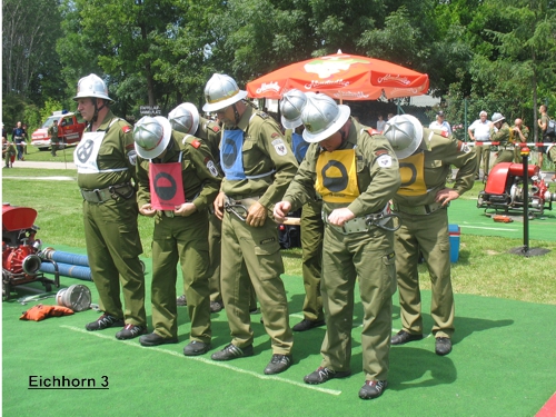 Eichhorn 3 hatte in Bronze eine gute Übung mit 35,4 allerdings meinte ein Bewerter, dass der Angriffstruppmann den C-Schlauch beim Verteiler nicht richtig abgelegt hatte und gab dafür eine 5-er. Trotzdem wurde Eichhorn 3 damit erster. In Silber eine durchschnittliche Übung mit 42,6 und diesmal fehlerfrei. Damit stand auch der Sieg in Silber fest.